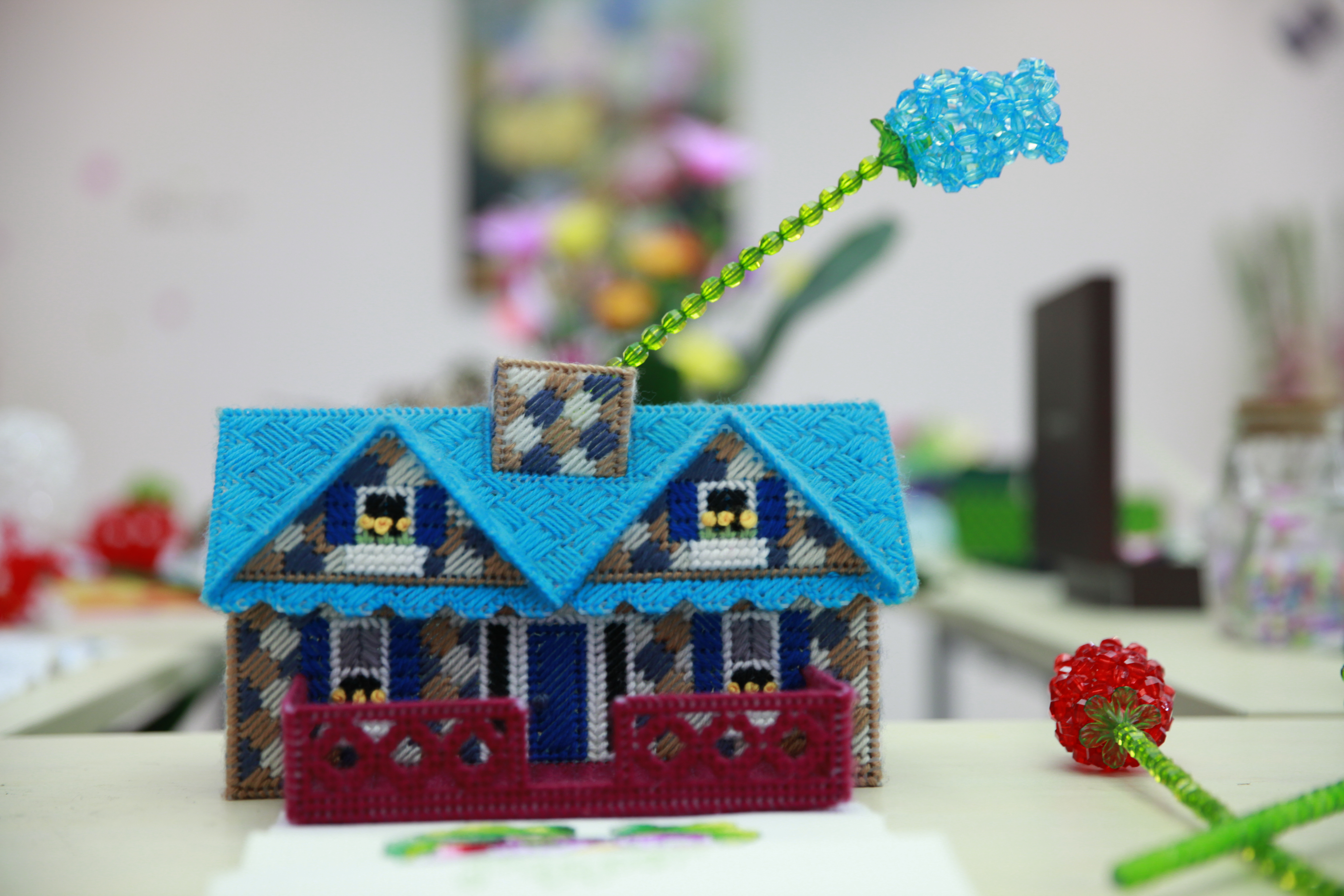 一針一線穿梭的十字繡,一筆一劃渲染的油畫,一雙雙厚實(shí)溫暖的毛線拖鞋,一件件或嬌艷或精致的串珠編織,披著可愛外衣的實(shí)用紙巾盒,利用廢鐵車制的工藝擺件……這些琳瑯滿目、構(gòu)思精巧的作品,既展示了女員工們對(duì)生活的熱愛與享受,對(duì)藝術(shù)的鑒賞與追求。